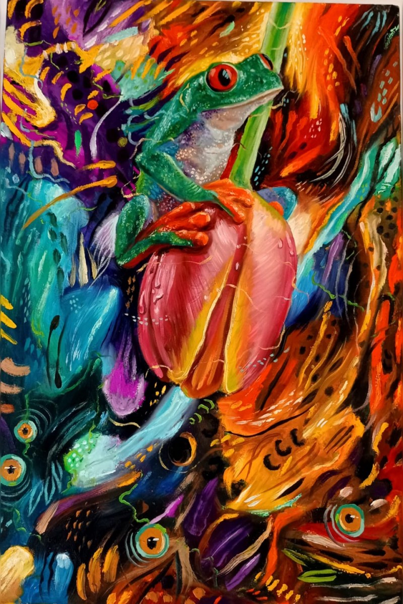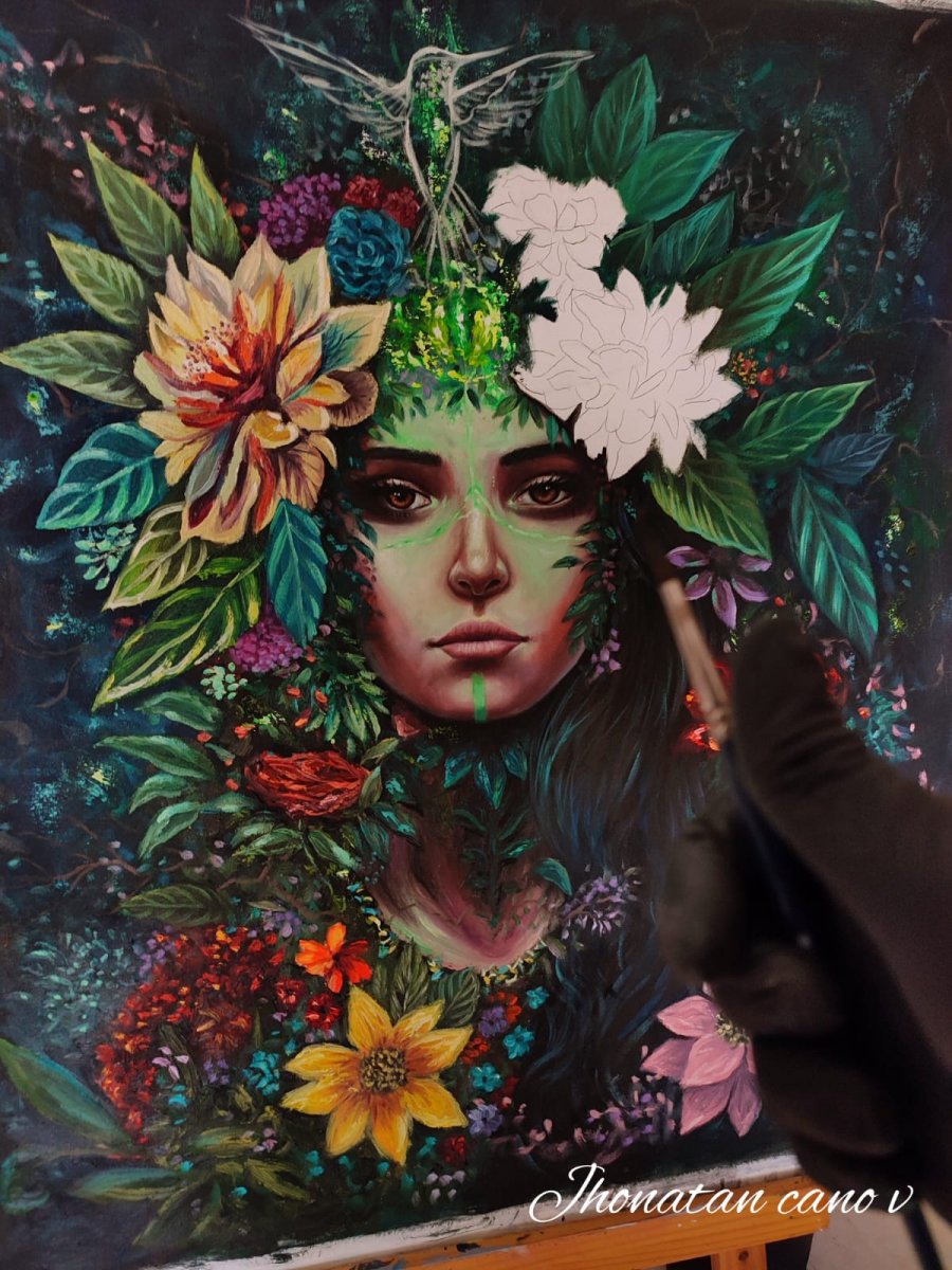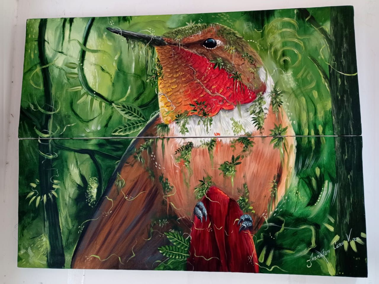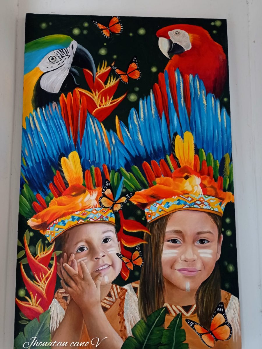 La magia del territorio amazónico está impregnado en cada pintura creada por esta artista oriundo de Puerto Leguizamo, la selva con ojos de jaguar, con textura de serpiente, con plumas de guacamaya, con flores coloridas le da fuerza al propósito artístico de Cano Vásquez: rendir homenaje al Putumayo.