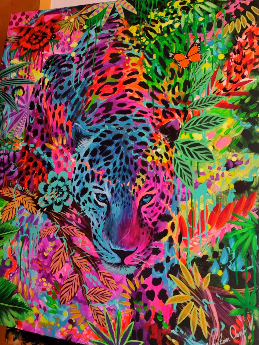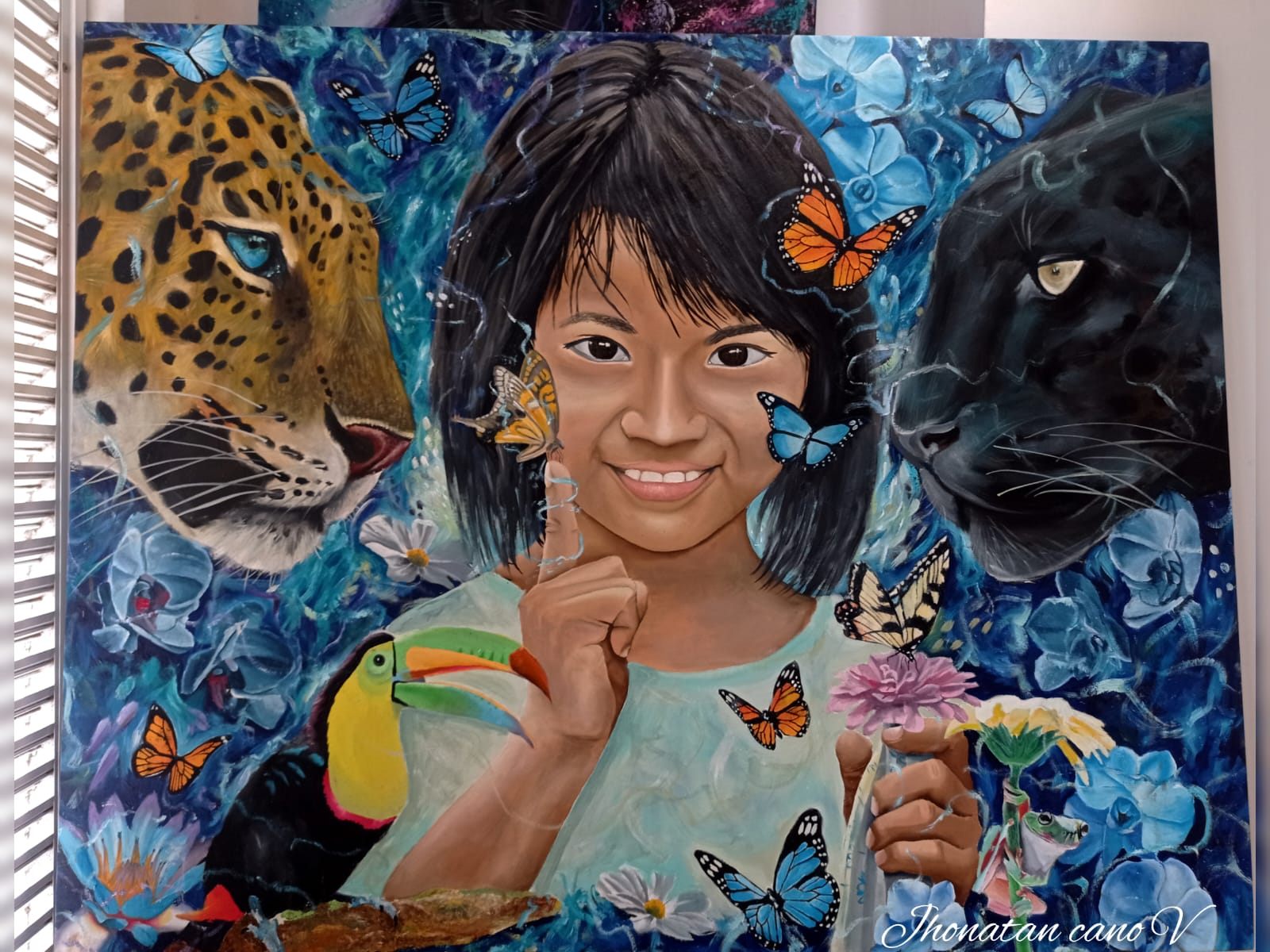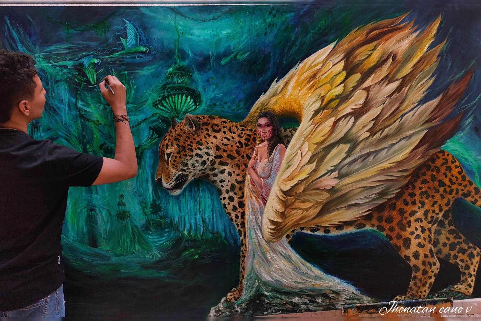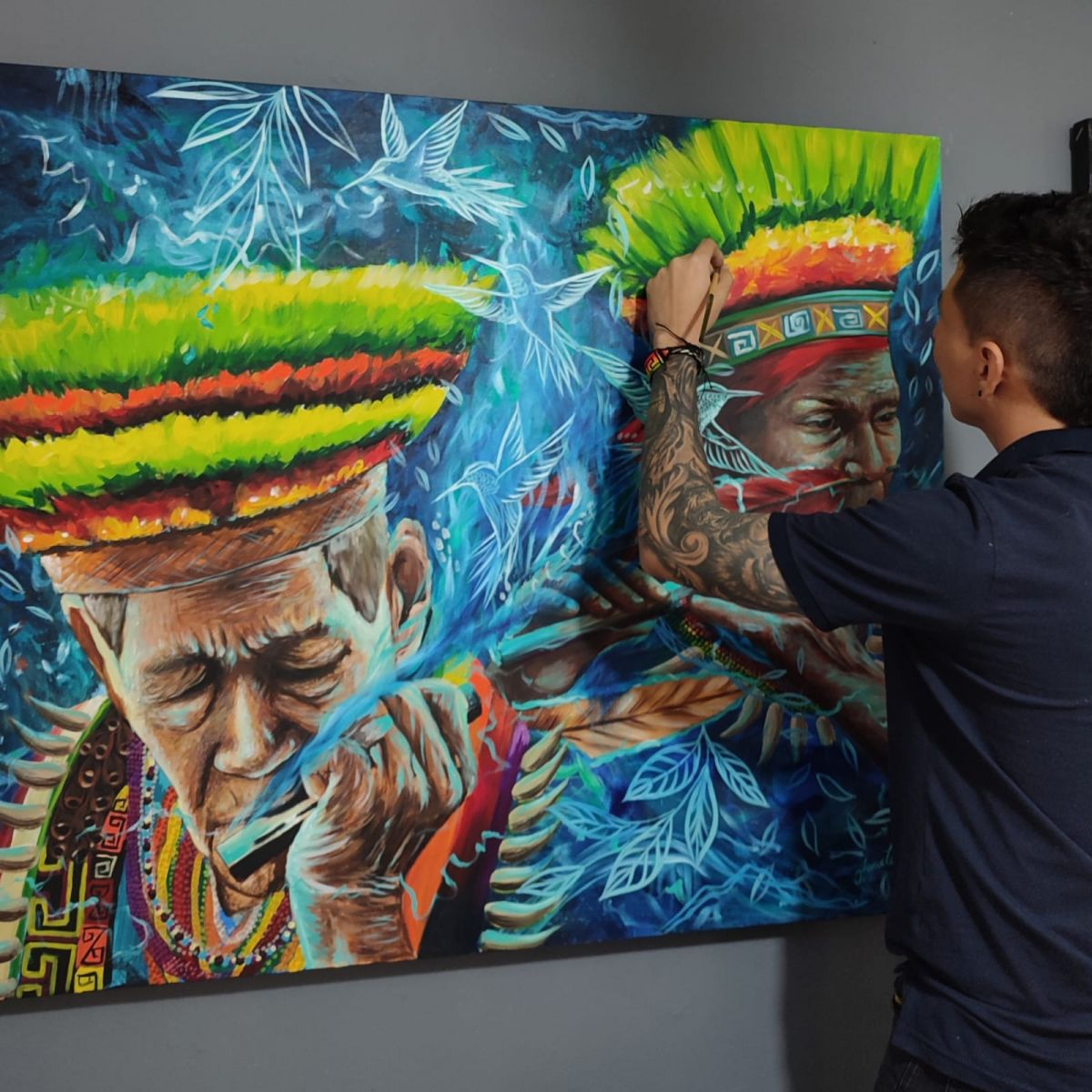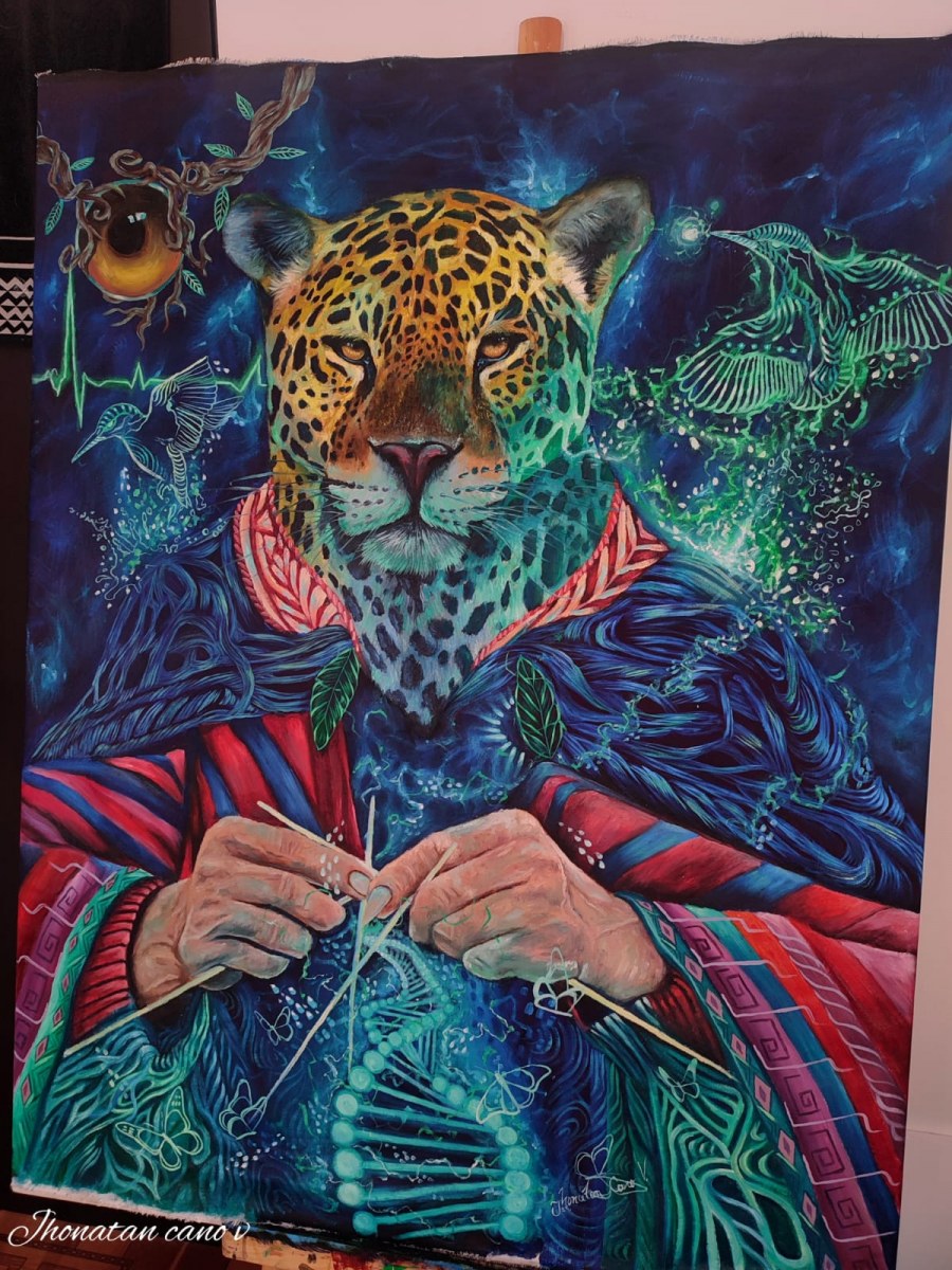 “Mi arte se caracteriza por representar nuestras culturas indígenas, los saberes de nuestros abuelos – taitas. Me gusta pintar la selva con sus animales de una forma mística, espiritual. Trato de representar en mis obras la medicina ancestral que es el yagé y ese misticismo que tiene nuestro Putumayo”, explica el artista de 30 años.
