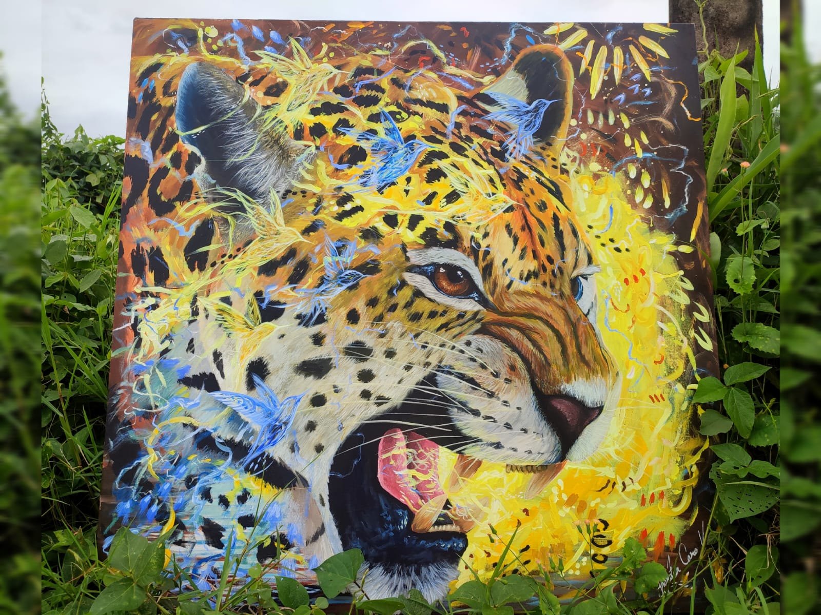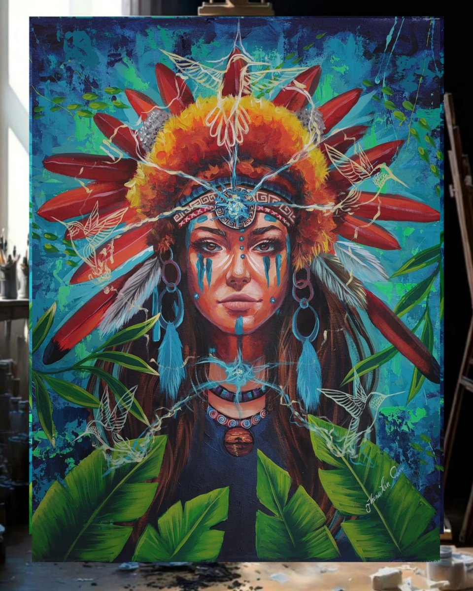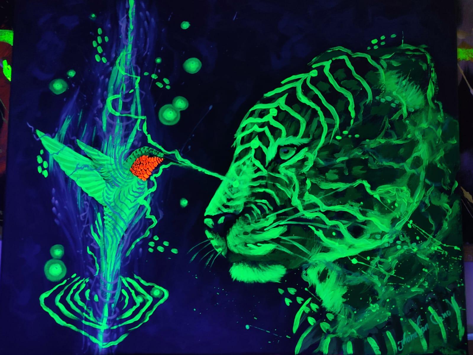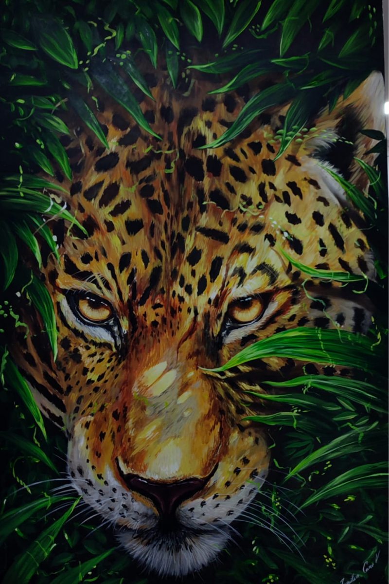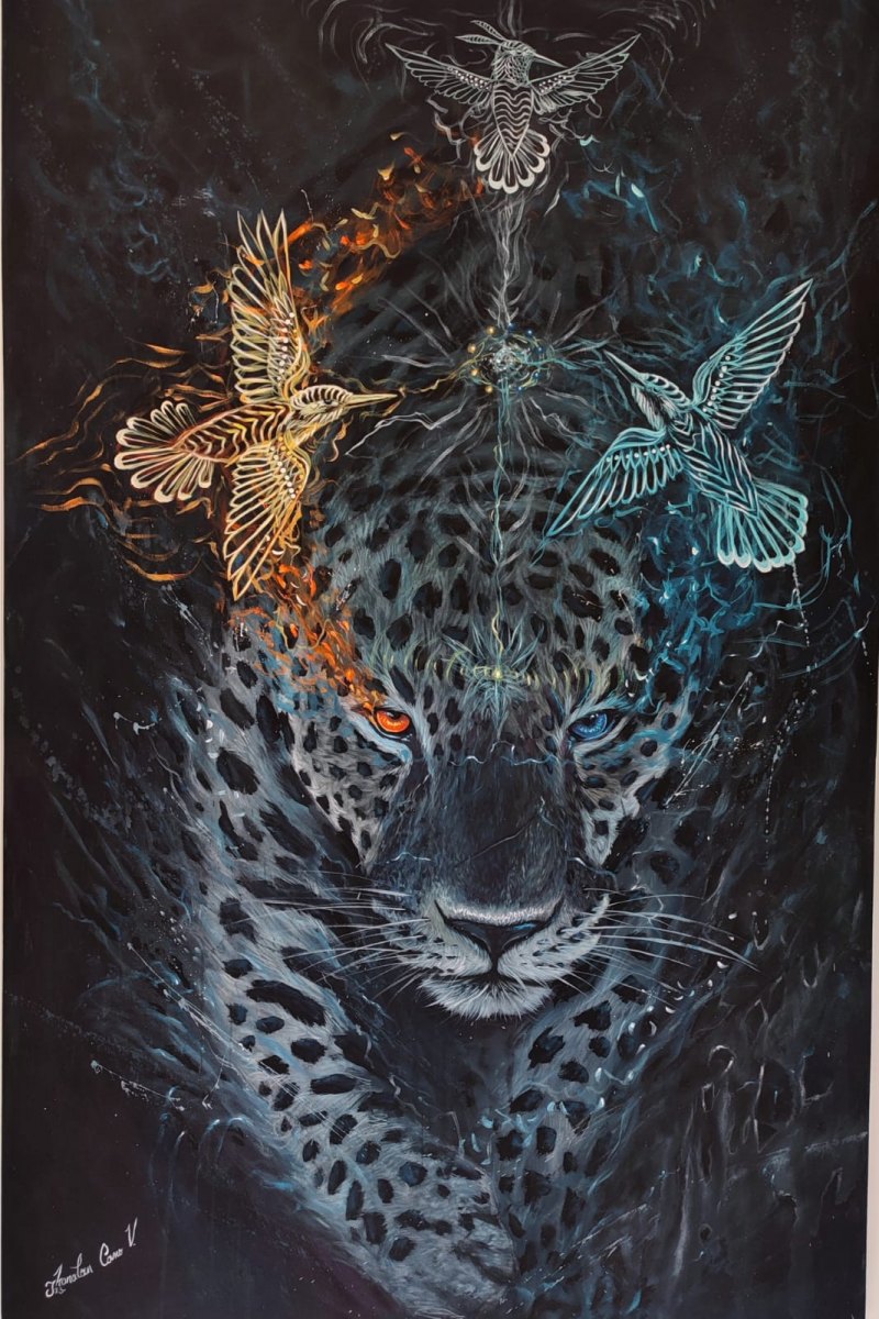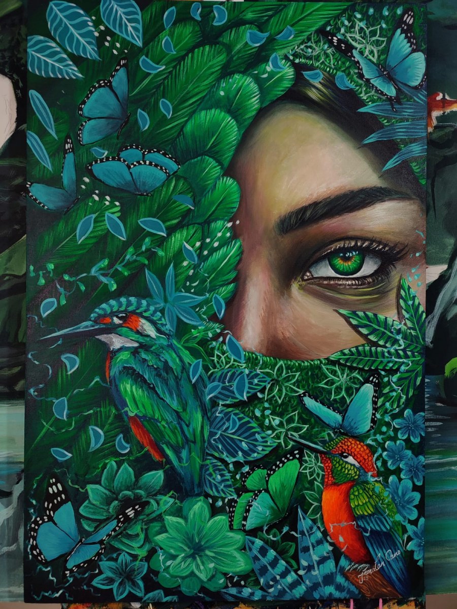 “Mi arte se caracteriza por representar nuestras culturas indígenas, los saberes de nuestros abuelos – taitas. Me gusta pintar la selva con sus animales de una forma mística, espiritual. Trato de representar en mis obras la medicina ancestral que es el yagé y ese misticismo que tiene nuestro Putumayo”, explica el artista de 30 años.