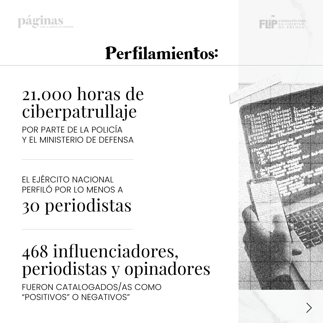 A esto se suma una estrategia de perfilamientos y de vigilancia estatal. La fuerza pública y el Ministerio de Defensa invirtieron más de 21 mil horas en ciberpatrullaje, el Ejército perfiló a más de 30 periodistas, y la presidencia categorizó a 468 influencers o líderes de opinión.