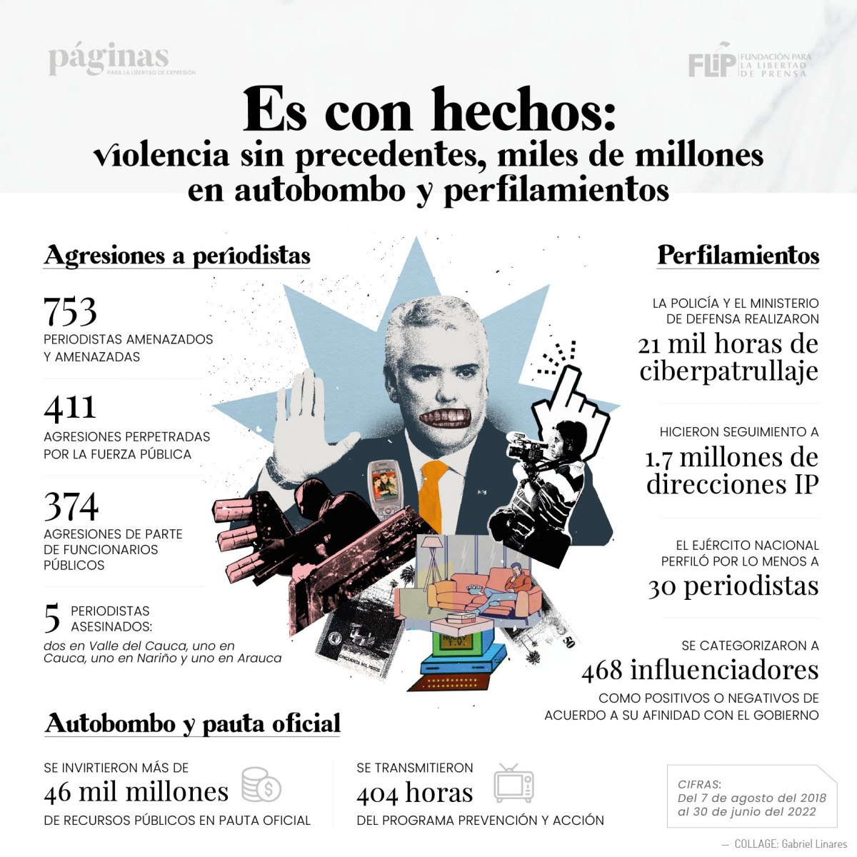 Y mientras la violencia contra la prensa incrementaba, el presidente Duque invirtió más de 46 mil millones de recursos en pauta oficial para favorecer su imagen. Además, triplicó la cantidad de personas que hacían parte de su equipo de comunicaciones.