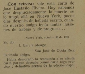 Antes de llegar a Nueva York en abril de 1928, José Eustasio Rivera pasó por Costa Rica. ¿Cuál era su interés en las tierras ticas? Una carta con fecha 30 de octubre de 1928 dirigida a don Joaquín García Monge, escritor y editor costarricense, revela la vitalidad intelectual del huilense, un mes antes de su fallecimiento.