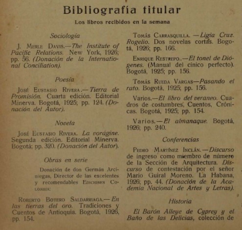 La Editorial Andes presenta, como muestra de sus labores y en desarrollo de su programa cultural, la novela del escritor colombiano José Eustasio Rivera, intitulada La Vorágine, que también será publicada en inglés aquí y en otras lenguas en Europa. Esta obra lleva ya cuatro ediciones, y es una de las más descollantes de la época actual, según lo declaran en fervorosos juicios autorizados escritores de gran reputación literaria.