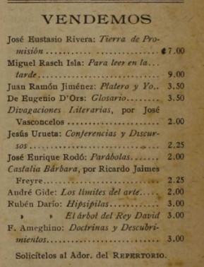 Como se deduce de la carta, el señor García Monge y Rivera habían intercambiado comunicación con anterioridad. El objetivo de José Eustasio era promover su Editorial Andes, contando con la experiencia editorial de don Joaquín. Un vehículo excepcional para hacer conocer su proyecto era Repertorio Americano: “Ojalá que usted, si encuentra plausible mi programa, ponga alguna nota sobre el particular en su periódico, que es la paloma mensajera de cuantos nos interesamos por cosas literarias.” En su vitalidad intelectual y visión empresarial, Rivera quería “entrar en relaciones con las casas editoras de América, en el sentido de establecer aquí (Nueva York) una agencia o muestrario de los libros que se publiquen, a fin de mantener al corriente en este país a los lectores de lo que valemos.”