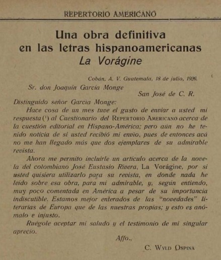 Curiosamente Rivera ya había enviado a García Monge, en febrero de 1926, sus dos títulos. En su biblioteca personal se encontraron Tierra de promisión con la dedicatoria: “A J. García Monge, cordialmente. El autor”, y La Vorágine: “A J. García Monge con sentimientos de admiración y simpatía, José Eustasio Rivera”. ¿No leyó en su momento don Joaquín García La Vorágine? ¿La leyó y no la apreció positivamente? ¿La leyó posterior a la carta de Wyld Ospina? El editor de Repertorio recibía gran cantidad de libros y correspondencia de autores de muchos países. Es posible que hubiera pospuesto la lectura de La Vorágine. En todo caso el artículo de Wyld Ospina se publicó