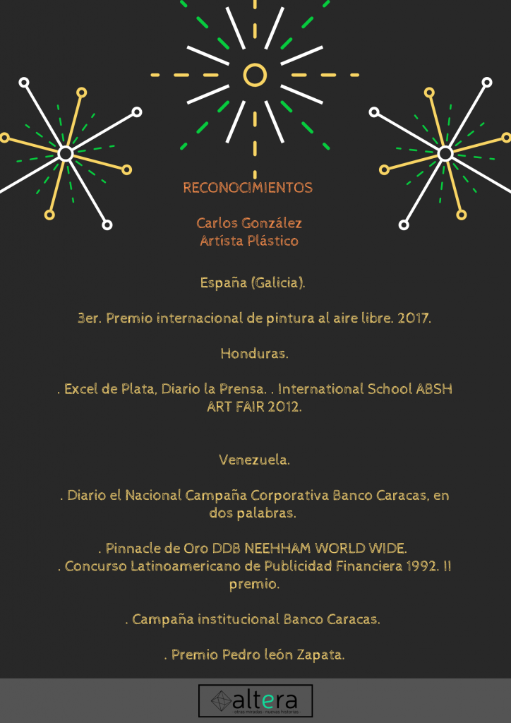 Desde temprana edad Carlos González tuvo la oportunidad de vivir en el Amazonas junto con las Tribus Yanomami, Maquiritare, Guahibo y Warao, culturas que influenciaron en su modo de percibir la naturaleza, la cual puede más tarde expresar en su arte. Tomó estudios de arte en diferentes escuelas, complementando su formación con el estudio personal de varios artistas y técnicas, hasta desarrollar un estilo propio. Por espacio de 20 años vivió en Centroamérica donde estudió la Cultura Maya, para posteriormente trasladarse a España, específicamente a Galicia, donde los orígenes Celtas de este territorio terminaron marcando su obra. Director de arte, diseñador gráfico e Ilustrador freelance. Graduado en Arte puro en la Escuela de Arte Cristóbal Rojas; graduado en Ilustración en la Escuela de Ilustración y Dibujo Publicitario, Francisco Pimentel y graduado en Técnicas de presentación, Storyboard, Rostros y Comic en la Cuadra Creativa con El Maestro Raúl Ávila.