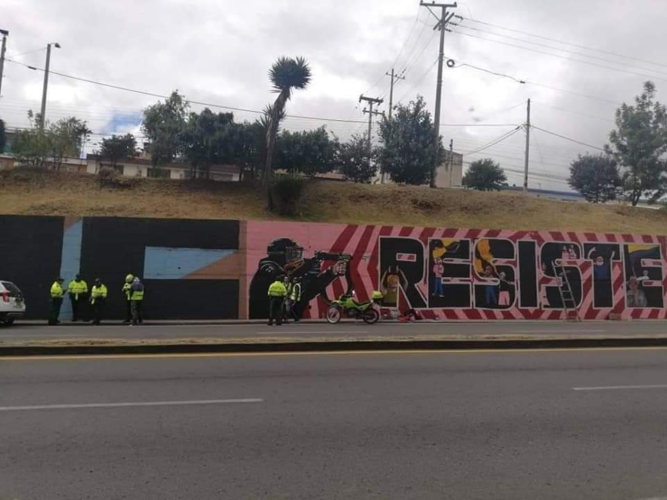 Un miembro del ESMAD disparando su arma contra un grupo de manifestantes indignados que gritan en silencio por entre las líneas de la palabra “Resiste”, es la escena del último mural sin permiso que realizó Hofman junto a dos colegas de la corporación Tejiendo Raíces en una avenida de su natal Tunja.